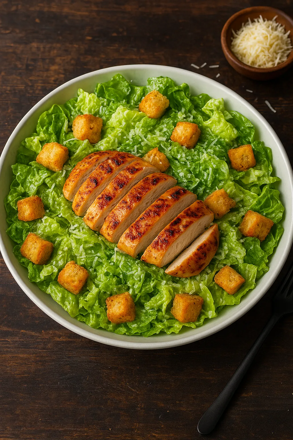 What makes this chicken Caesar salad special is the perfect balance of textures and flavors. Crisp romaine lettuce forms a fresh, crunchy base. Tender grilled chicken adds protein and savory depth, while crunchy croutons provide a satisfying bite. Freshly grated Parmesan contributes a salty, nutty flavor, and creamy dressing ties all the ingredients together. Carefully layered or tossed, the salad is visually appealing as well as delicious.