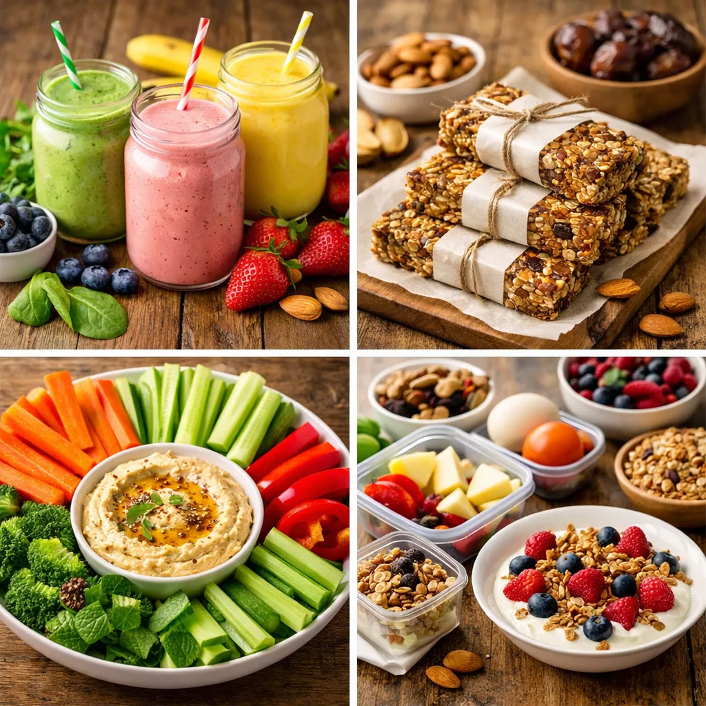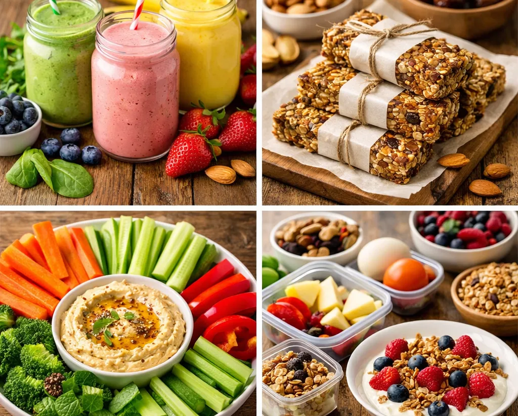 Здоровий перекус повинен поєднувати білки, складні вуглеводи та корисні жири. Наприклад, горіхи та насіння містять корисні жири та білки, фрукти та овочі – клітковину і вітаміни, а цільнозерновий хліб або сухі пластівці – повільні вуглеводи, що дають тривалу енергію.