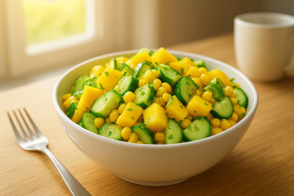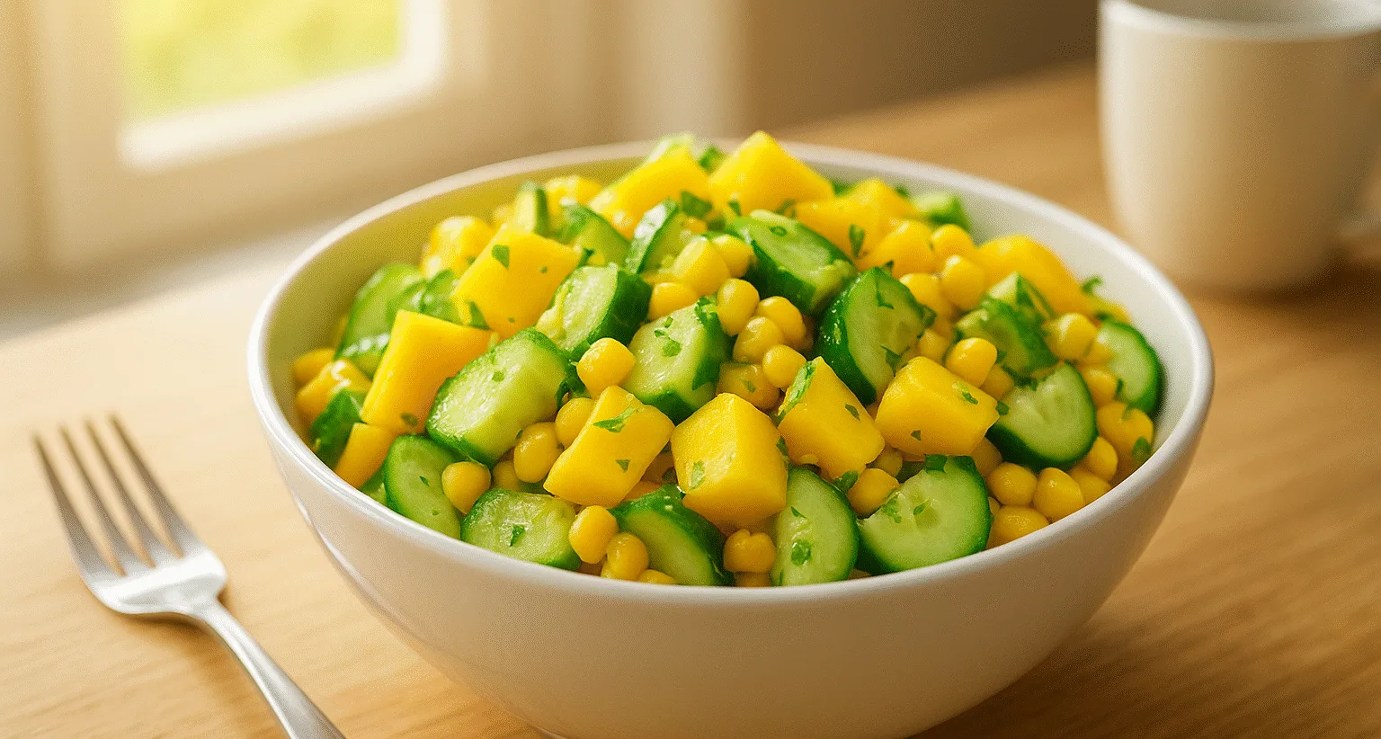 Ранок тільки починається, сонце заглядає у вікно, а на столі вже чекає свіжий, хрусткий та неймовірно ароматний швидкий сніданок, який миттєво піднімає настрій і заряджає енергією. Звучить як мрія? А насправді це реальність — і приготувати його можна всього за 5 хвилин. Цей сніданок вже завоював сотні кулінарних сердець: соковите манго, хрусткі огірки та солодка кукурудза створюють ідеальне поєднання смаку та користі.