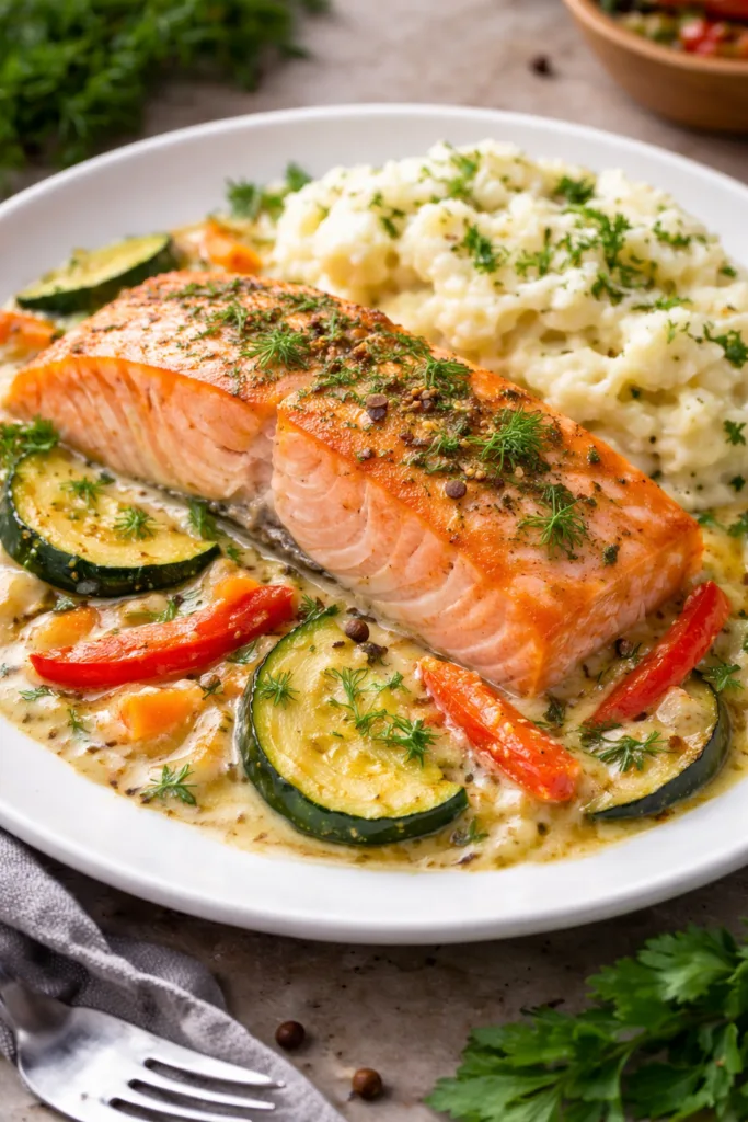Філе червоної риби у вершково-гірчичному соусі з овочами
