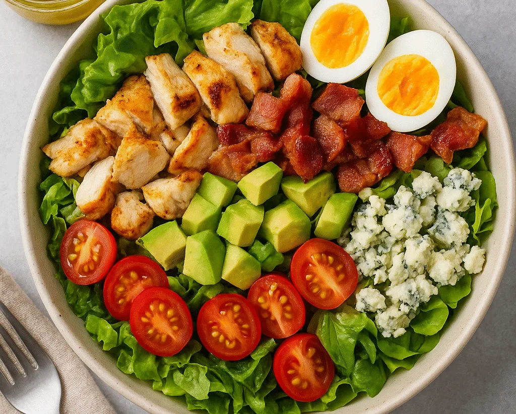 Змішати заправку (олія + лимонний сік + гірчиця + мед + спеції) і полити салат перед подачею.