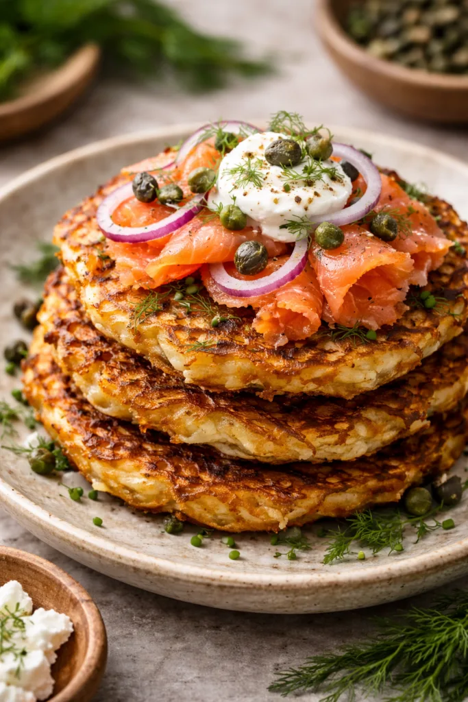 Деруни з лососем — це свіжий погляд на класичну українську страву. Картопляні деруни, хрусткі ззовні та м’які всередині, стають основою для святкової подачі, якщо додати ніжний слабосолений лосось і кремовий сир. Таке поєднання смаків приваблює як шанувальників традиційної кухні, так і тих, хто любить експериментувати на власній кухні.