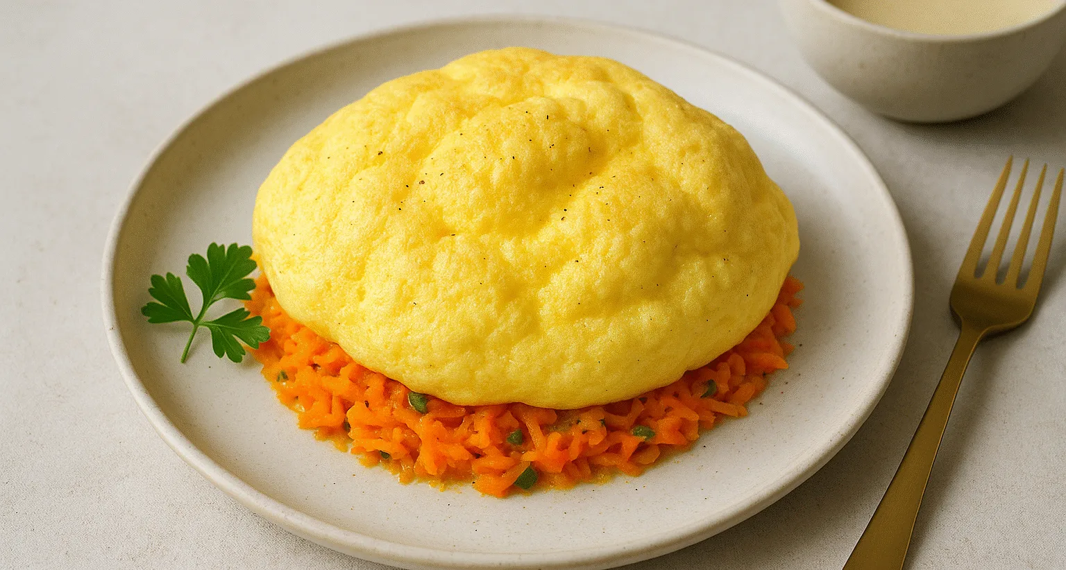 Морква, як маленький сонячний промінчик на тарілці, лежить на дні, додаючи ніжної солодкості кожному шматочку. Інші овочі, що потрапляють у страву, роблять її текстурно цікавою: ніжні, м’які, але водночас відчутні під зубами. Омлет виходить повітряним і трохи горіховим на смак завдяки легкому додатку рослинного борошна. Його можна подавати на тарілці так, щоб кожен шар залишався помітним, ніби маленький акцент на увазі сніданку.
