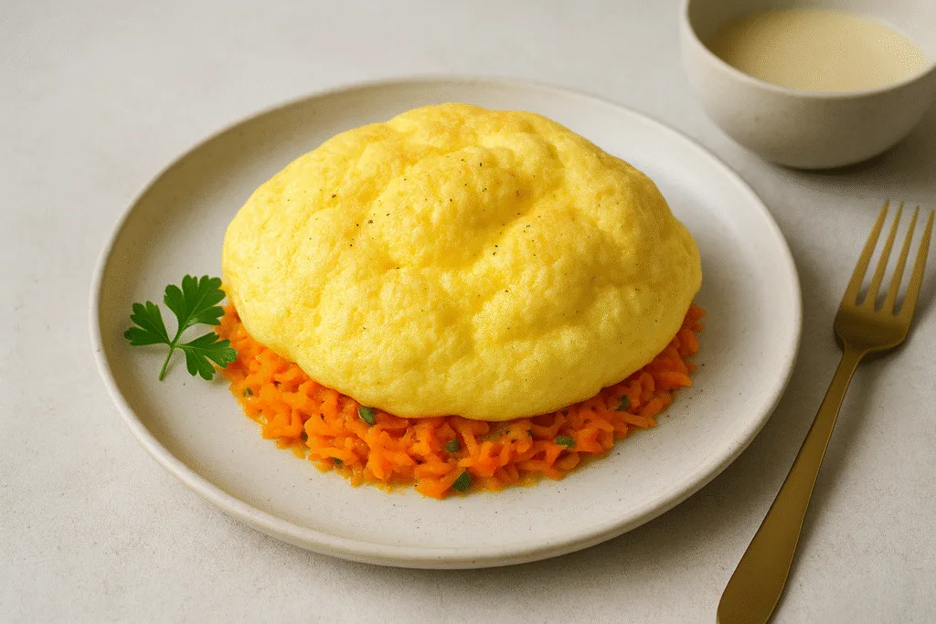 Морква, як маленький сонячний промінчик на тарілці, лежить на дні, додаючи ніжної солодкості кожному шматочку. Інші овочі, що потрапляють у страву, роблять її текстурно цікавою: ніжні, м’які, але водночас відчутні під зубами. Омлет виходить повітряним і трохи горіховим на смак завдяки легкому додатку рослинного борошна. Його можна подавати на тарілці так, щоб кожен шар залишався помітним, ніби маленький акцент на увазі сніданку.