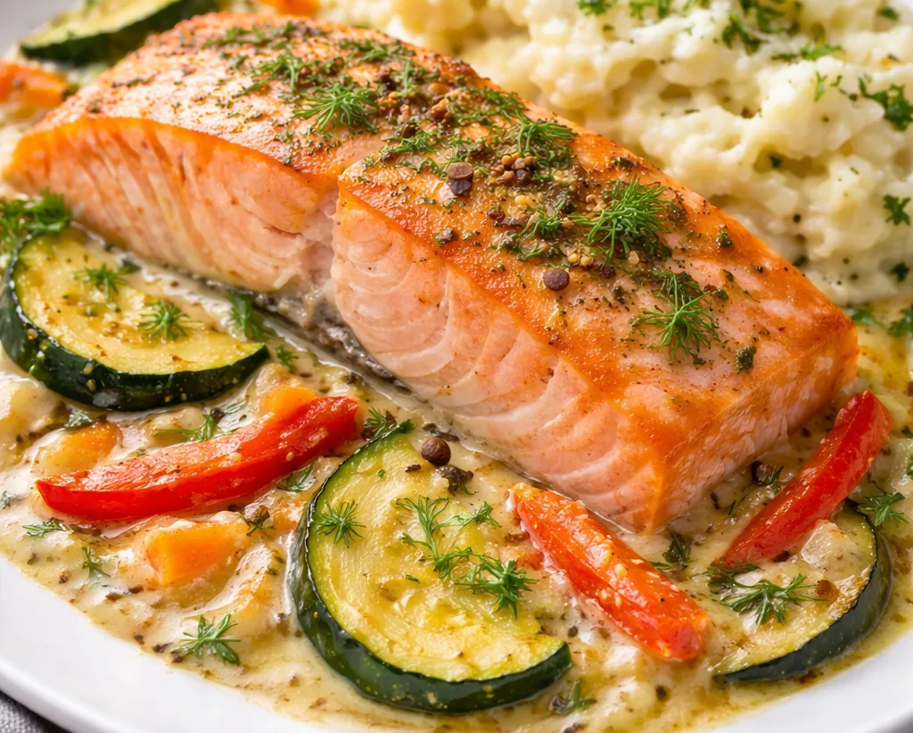 Філе червоної риби у вершково-гірчичному соусі з овочами