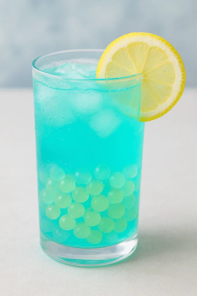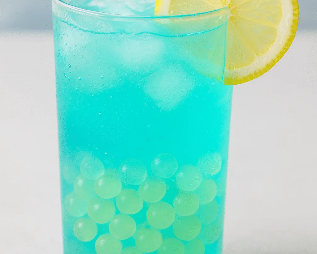Влийте суміш у склянку — напій набуде м’яко бірюзового кольору, а прозорі гелеві “світлячки” будуть красиво переливатися.