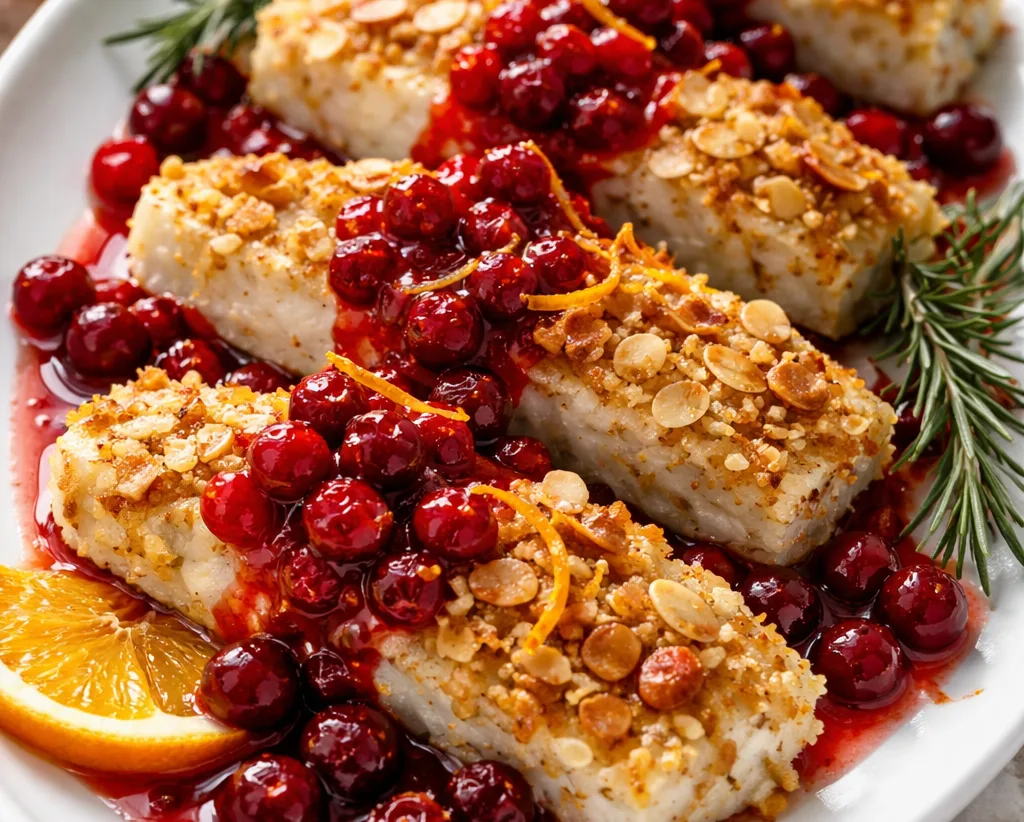 Хек у мигдально-цитрусовій скоринці з журавлинним соусом