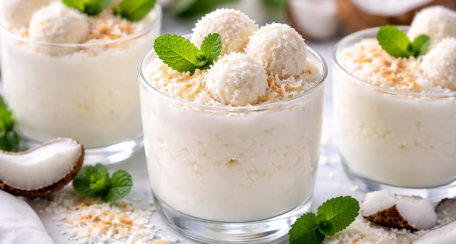 Перед подачею прикрасьте кокосовою стружкою, кокосовими кульками та листочками м’яти.