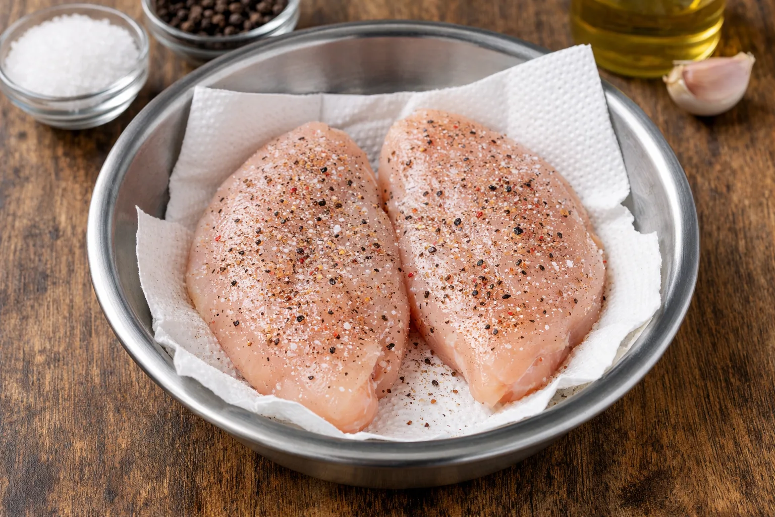 У мисці підготуйте куряче філе: промийте його та обсушіть паперовим рушником. Посоліть і поперчіть з обох боків, щоб м’ясо рівномірно просочилося спеціями.