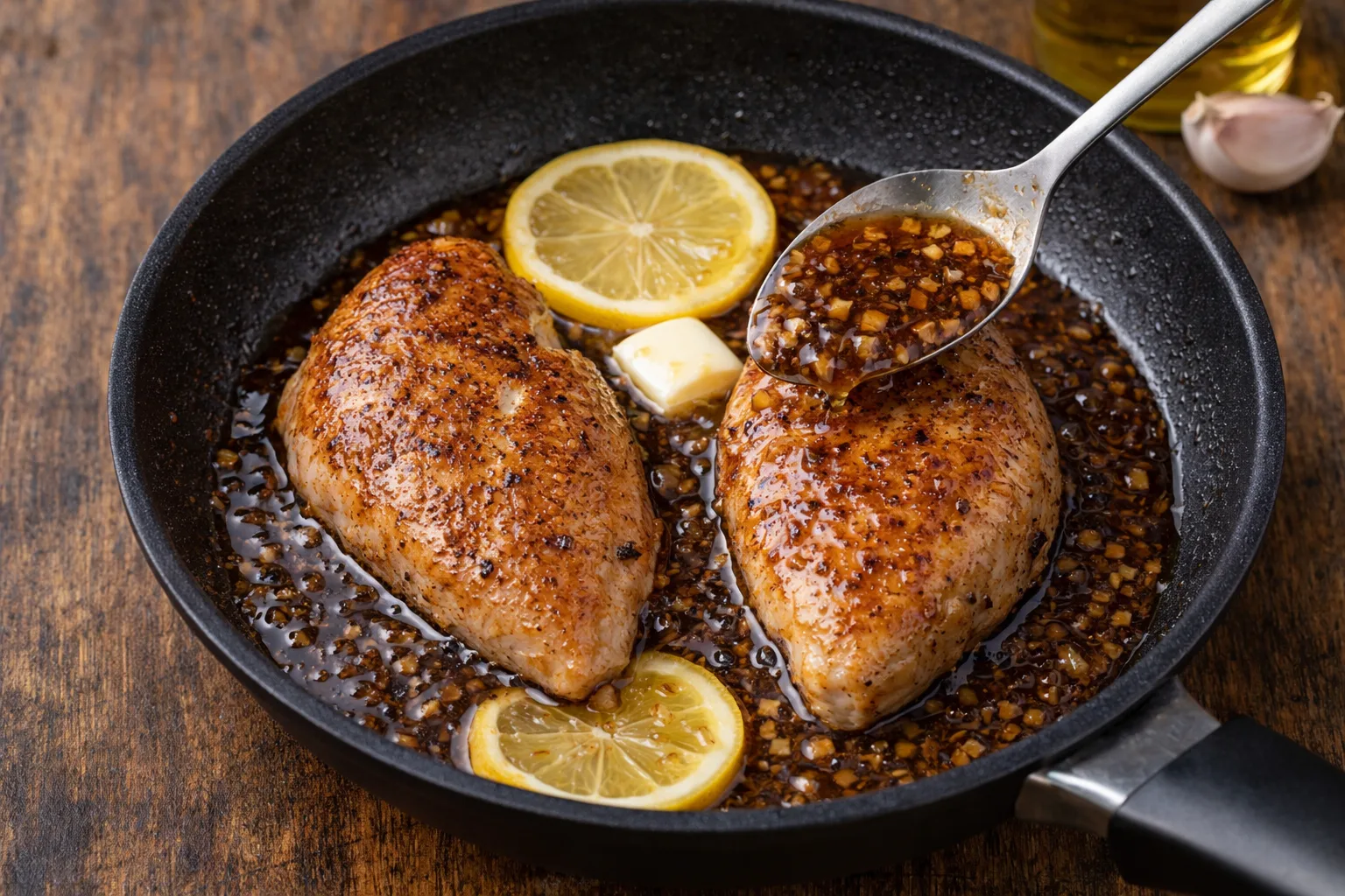 Влийте приготовлений соус у сковороду до курки. Додайте вершкове масло і кружальця лимона. Готуйте ще 4–5 хвилин, періодично поливаючи філе соусом, поки він загусне і стане блискучим.