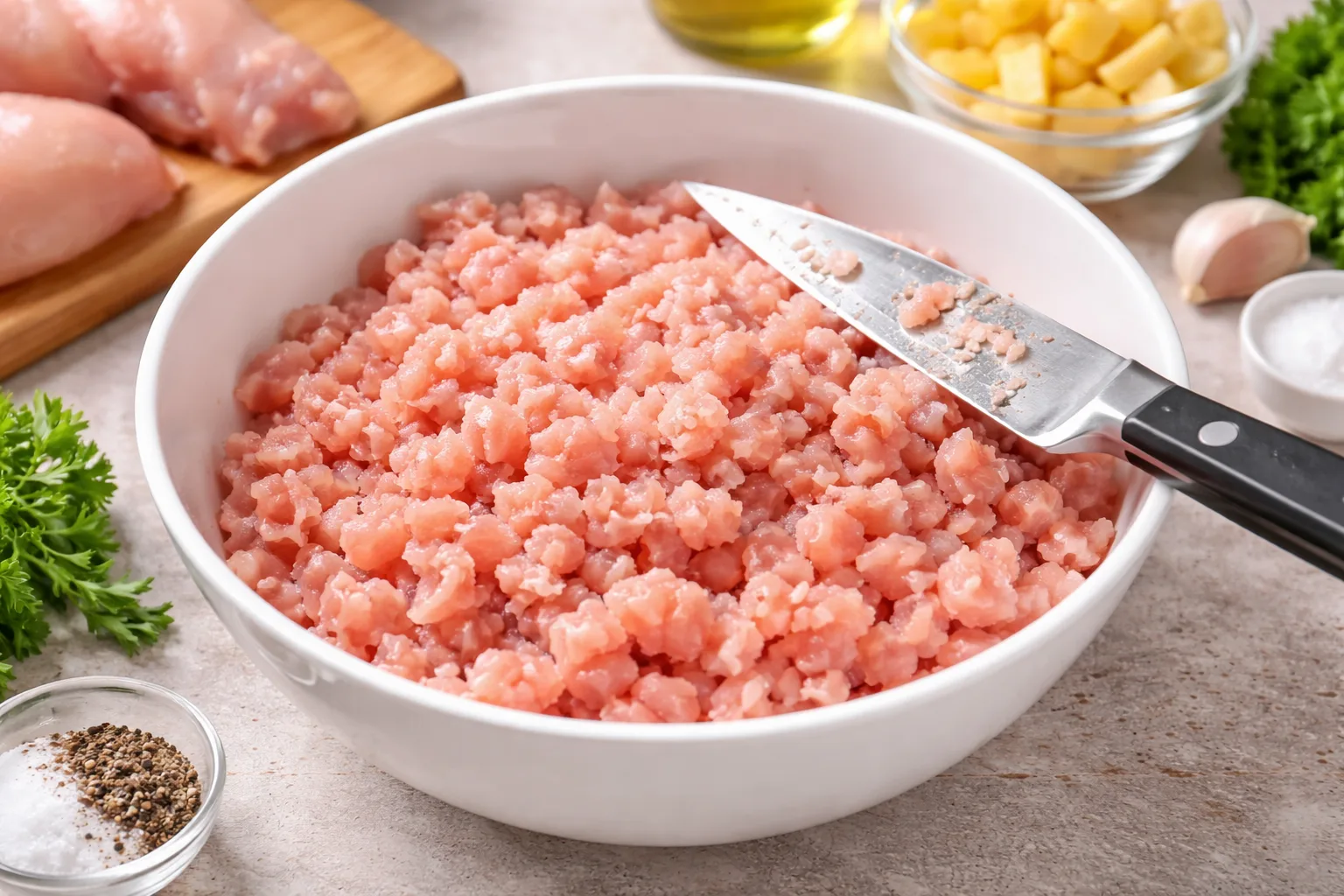 У мисці наріжте куряче філе дуже дрібними шматочками або подрібніть ножем.