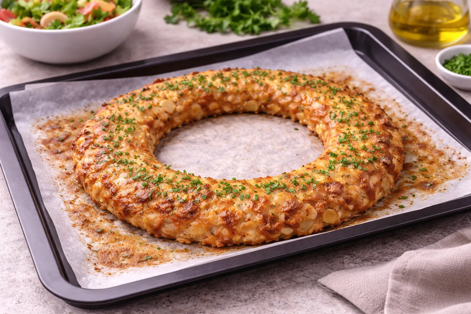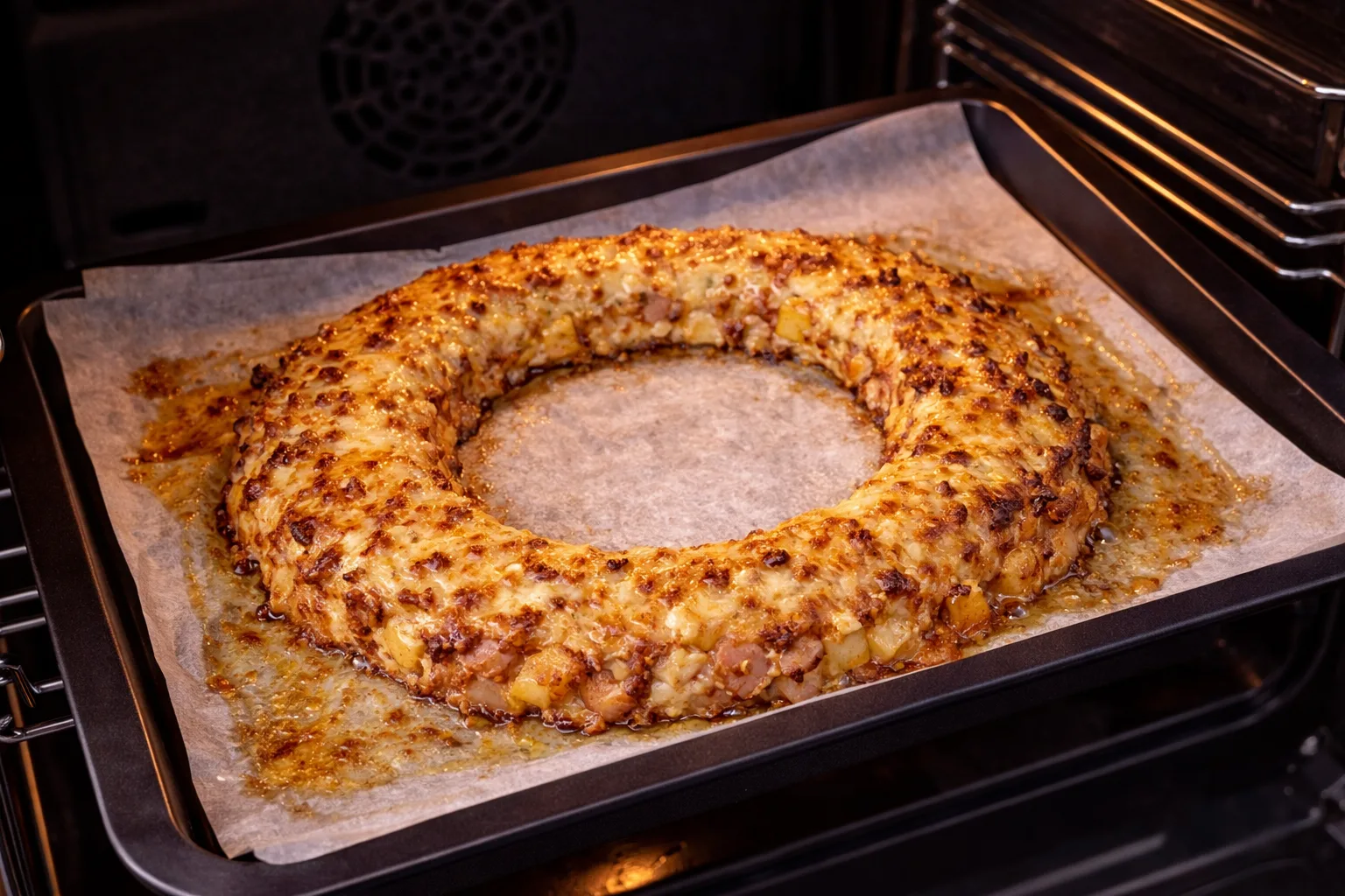 Страва у вигляді «корони» виглядає дуже ефектно і привертає увагу ще до того, як її скуштують. Така подача створює відчуття святковості навіть у звичайний день. Особливо красиво вона виглядає на великій тарілці, прикрашеній зеленню або свіжими овочами. Це чудовий варіант для сімейної вечері, прийому гостей або святкового обіду.