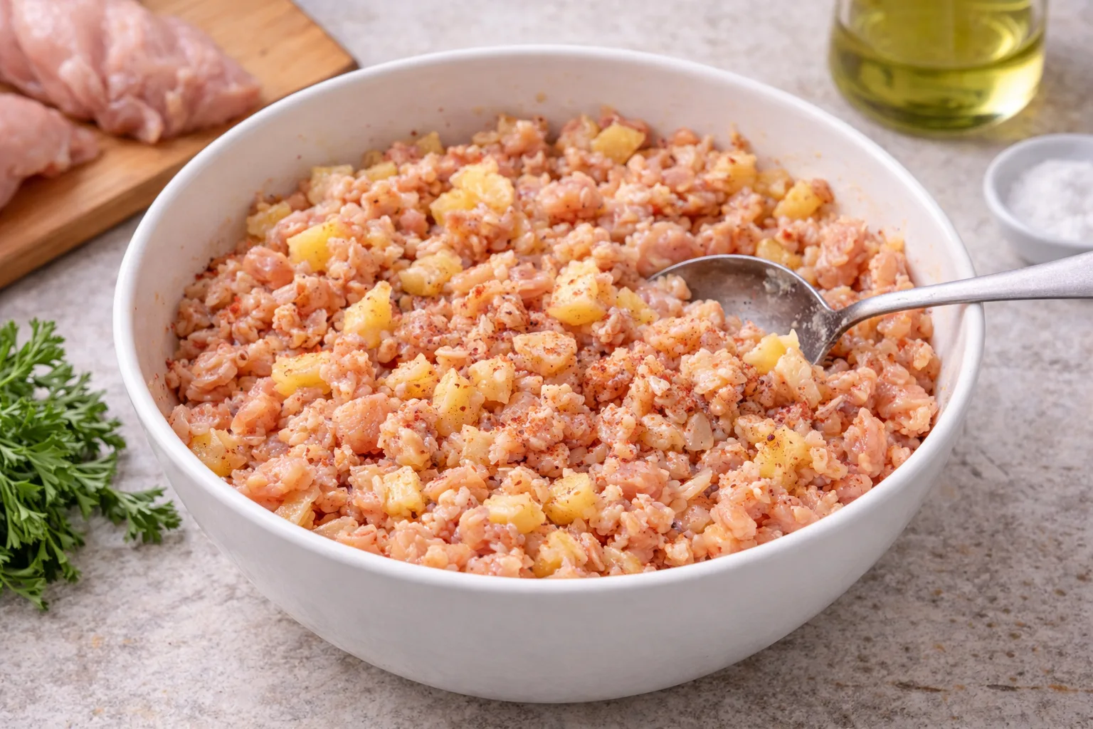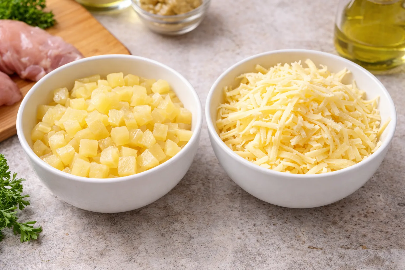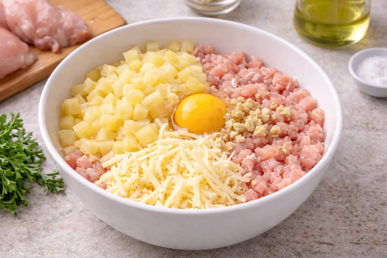 Ананас додає легку солодкість і робить куряче м’ясо більш соковитим, а сир надає ніжну кремову текстуру.З’єднайте інгредієнти