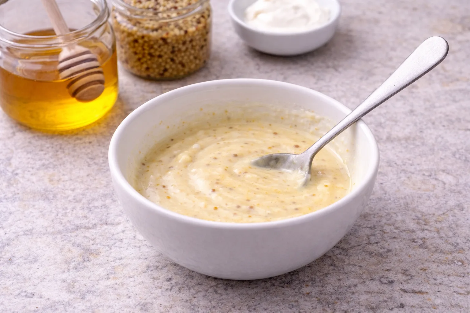 У невеликій мисці змішайте мед, гірчицю та сметану.