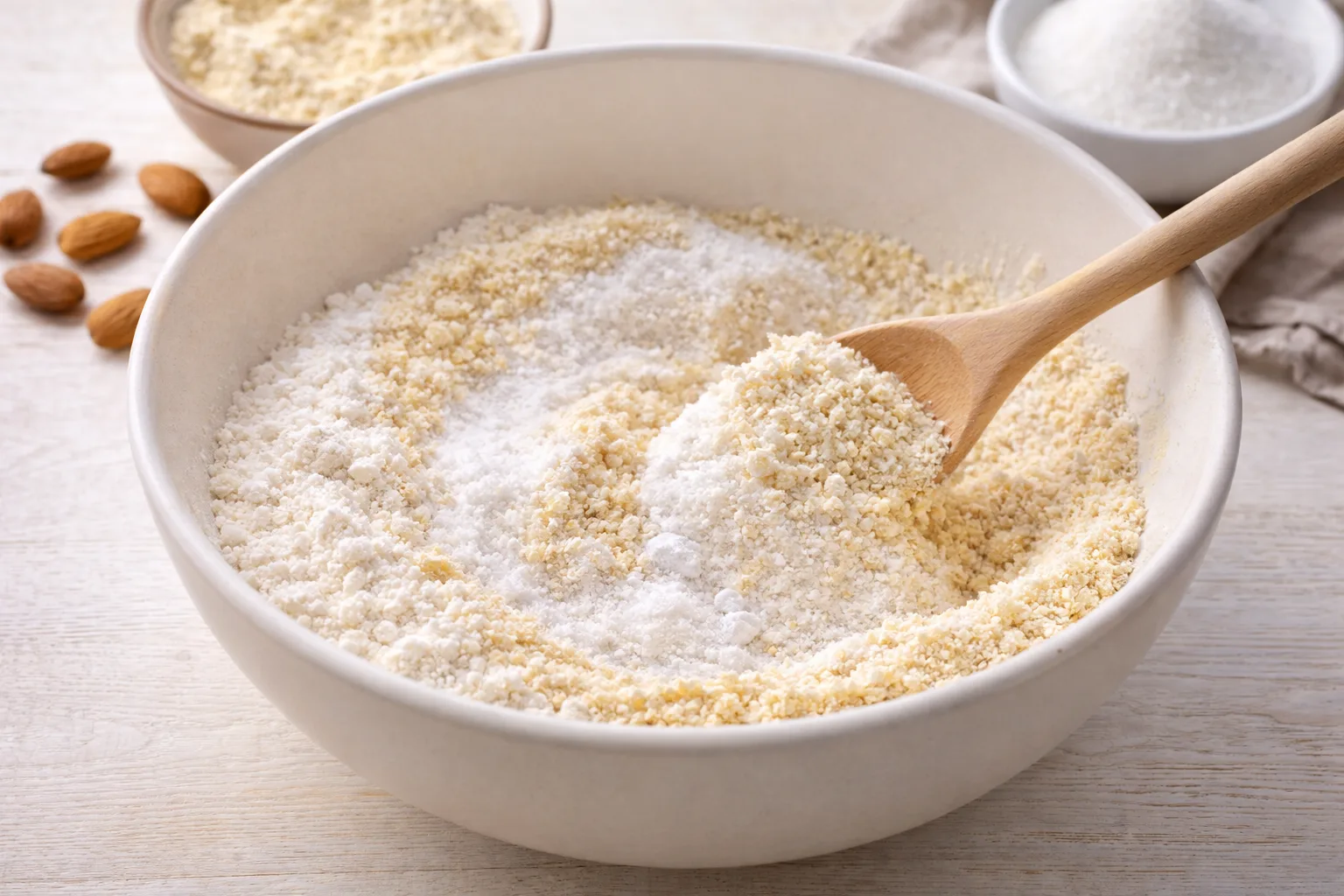 У велику миску насипте рисове борошно, мигдалеву муку, цукрозамінник і розпушувач тіста. Добре перемішайте, щоб усі інгредієнти рівномірно розподілилися.