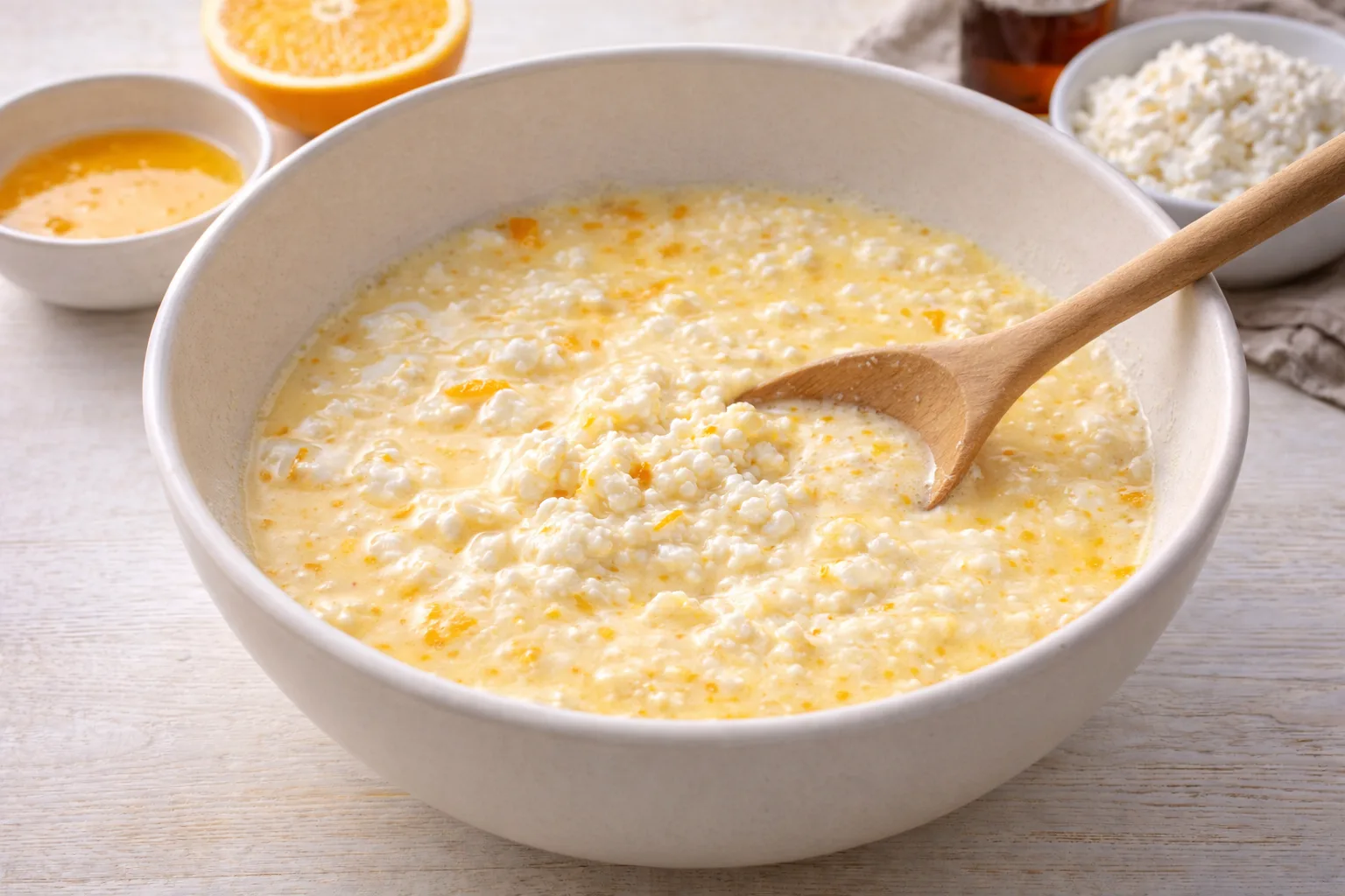 В іншій мисці збийте яйця до легкої піни. Додайте тепле молоко, творог, ванілін, апельсинову цедру та свіжовичавлений апельсиновий сік. Добре перемішайте до однорідної маси.