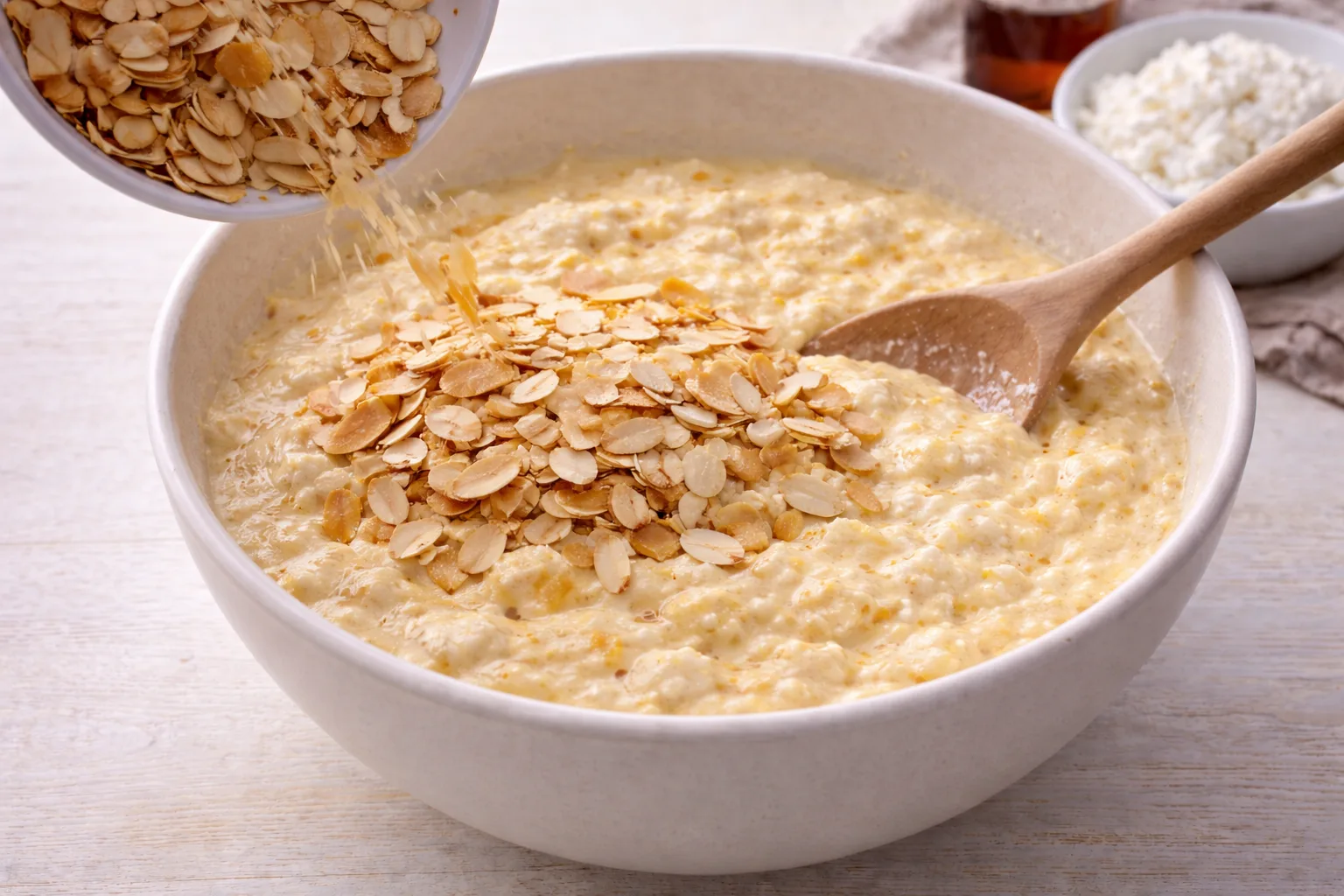 Додайте обсмажені мигдалеві пластівці та ще раз ретельно перемішайте тісто.