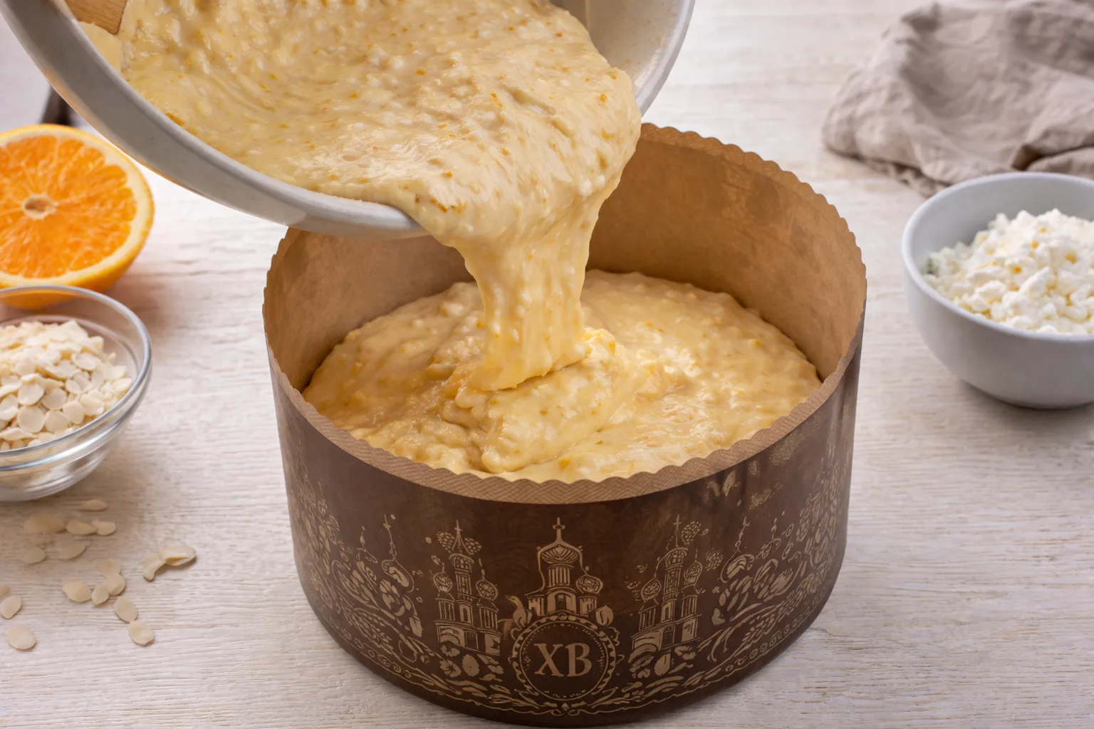 Перелийте готове тісто у форму для паски, застелену папером для випічки. Рівномірно розподіліть тісто по формі.