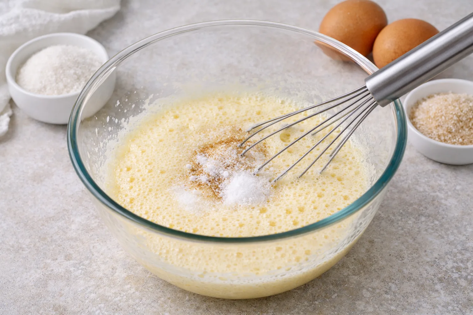 У мисці збийте яйця з цукром до світлої пухкої маси. Додайте ванільний цукор і щіпку солі.