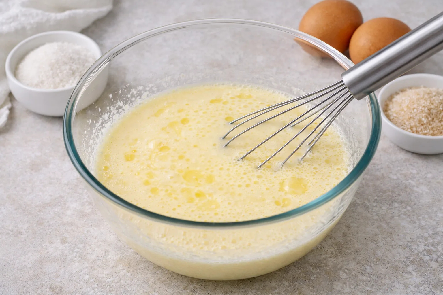Влийте тепле молоко та розтоплене вершкове масло. Перемішайте до однорідності.