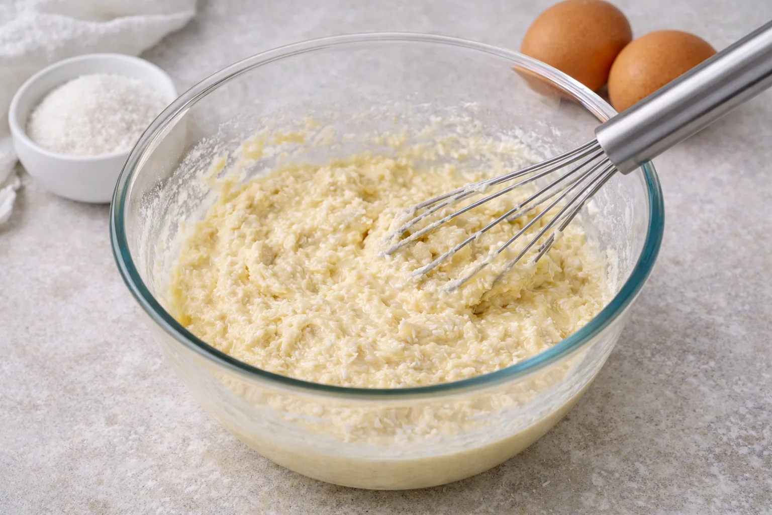 Просійте борошно разом із розпушувачем. Додайте кокосову стружку та замісіть ніжне тісто.