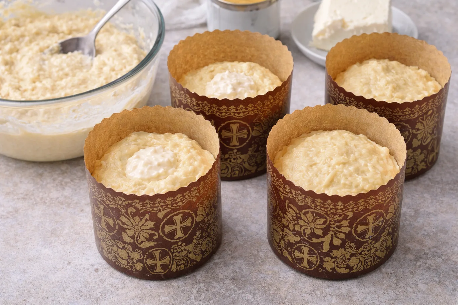 Викладіть частину тіста у паперові форми для пасок (приблизно половину). Додайте ложку начинки та накрийте рештою тіста.