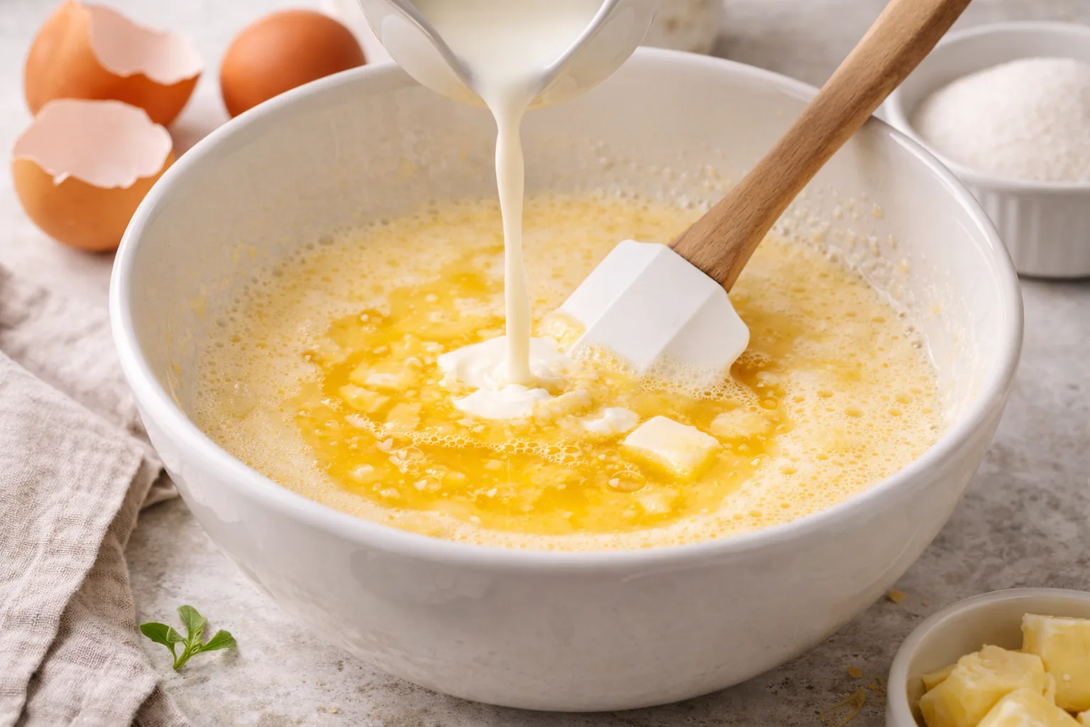 Влийте тепле молоко та розтоплене вершкове масло. Добре перемішайте.