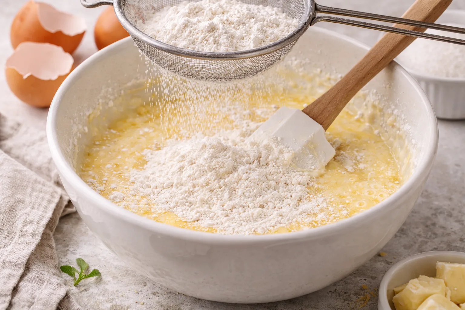 Просійте борошно з розпушувачем і сіллю. Поступово введіть у тісто, перемішуючи до однорідності.