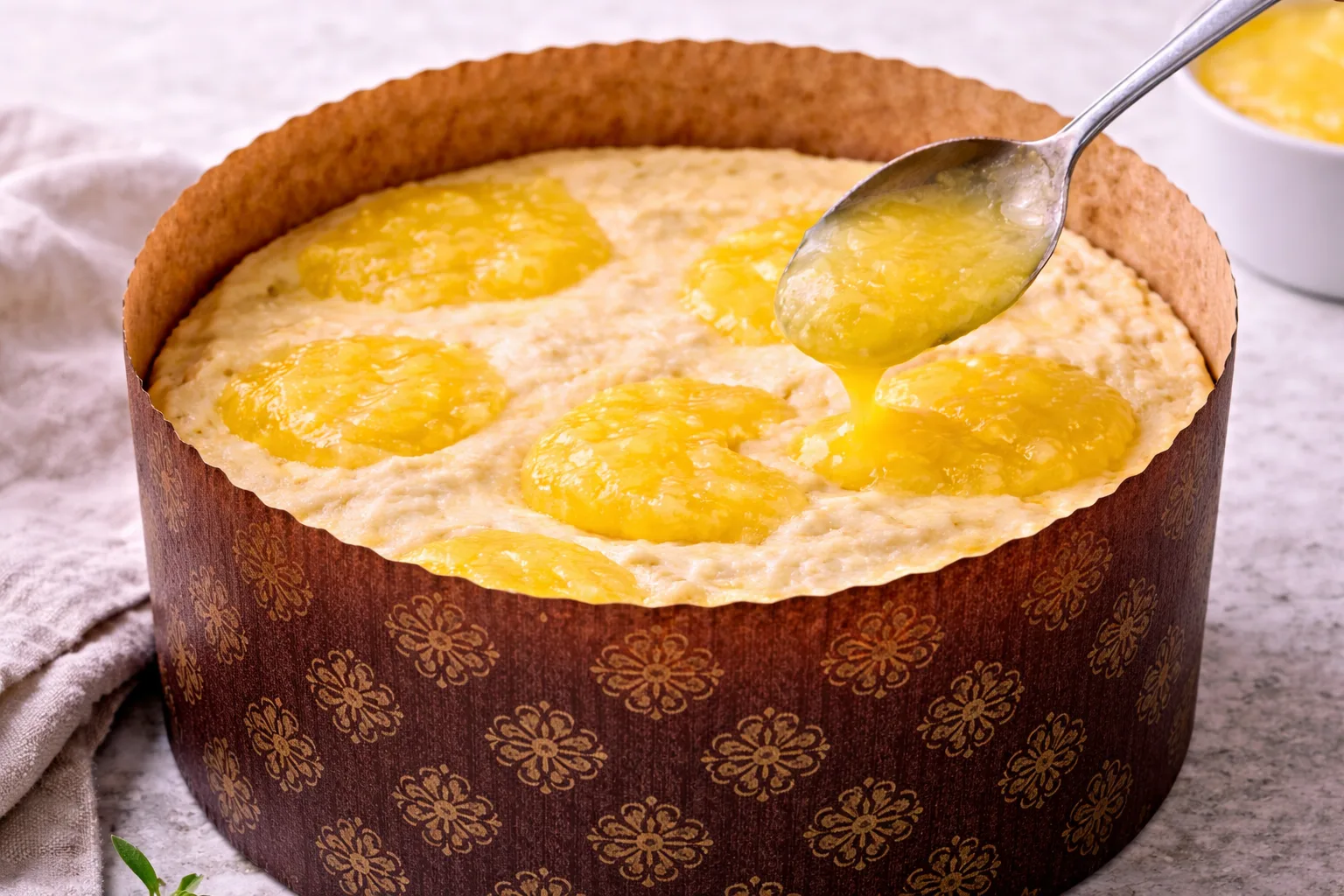 Викладіть частину тіста у форму. Додайте кілька ложок лимонного курду і накрийте рештою тіста.
