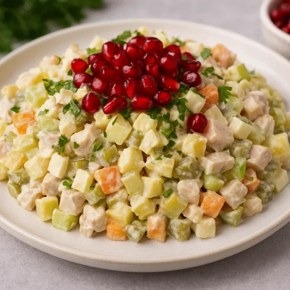 Викладіть салат на тарілку та прикрасьте зернами граната. Салат готовий до сервірування — яскравий, свіжий і святковий.