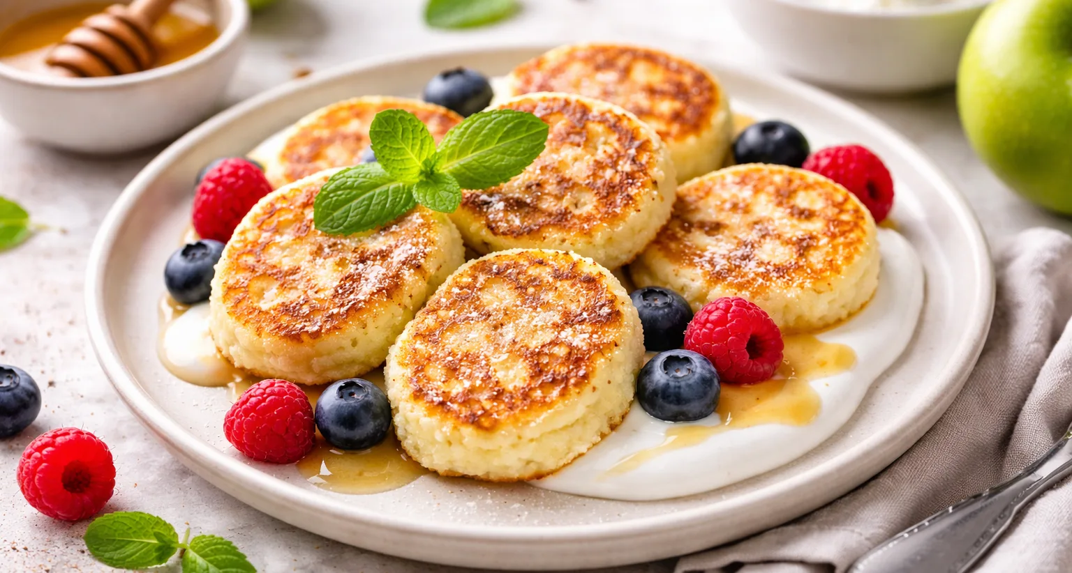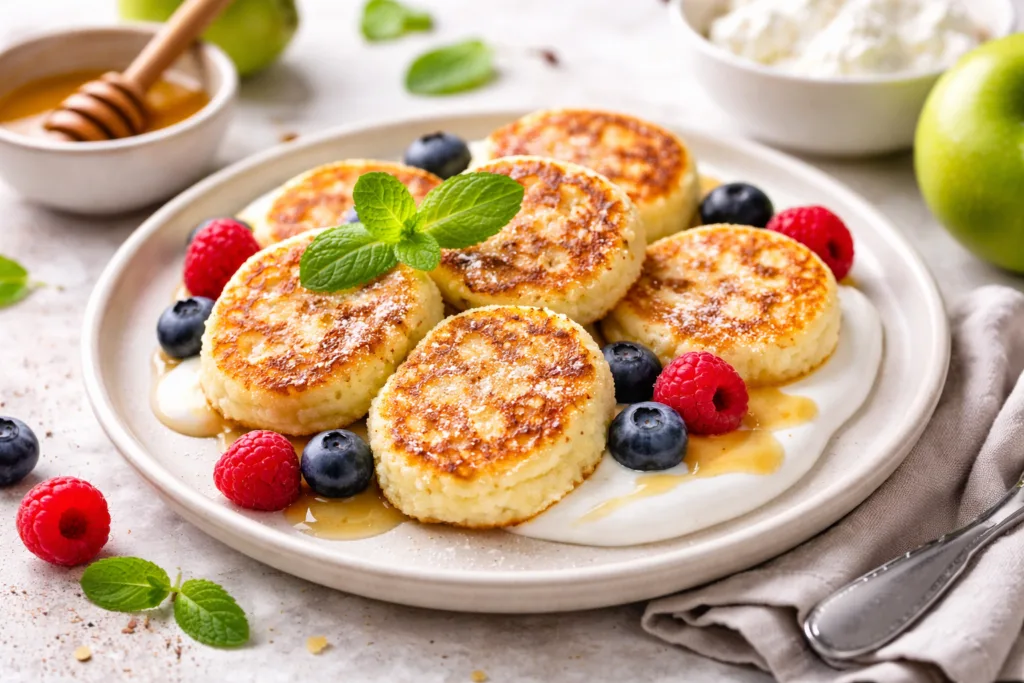 ✨ Для подачі сирники без борошна чудово смакують зі сметаною, медом, грецьким йогуртом або свіжими ягодами. Це зробить сніданок ще більш ароматним і красивим.