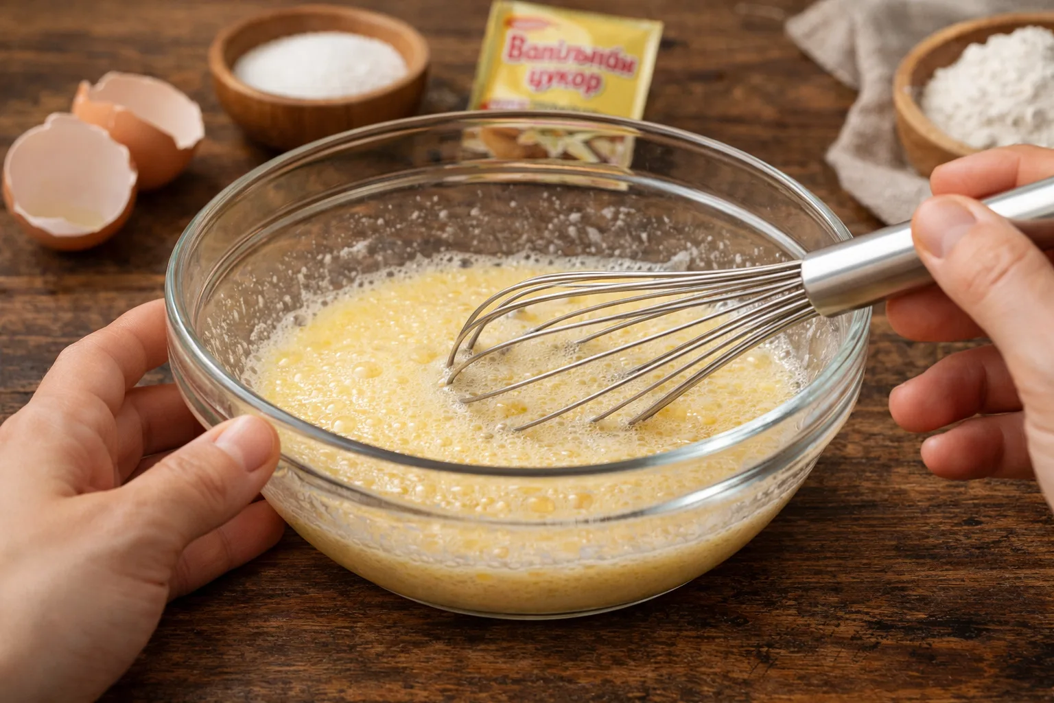 У мисці збийте яйце з цукром і ванільним цукром до легкої однорідної маси.
