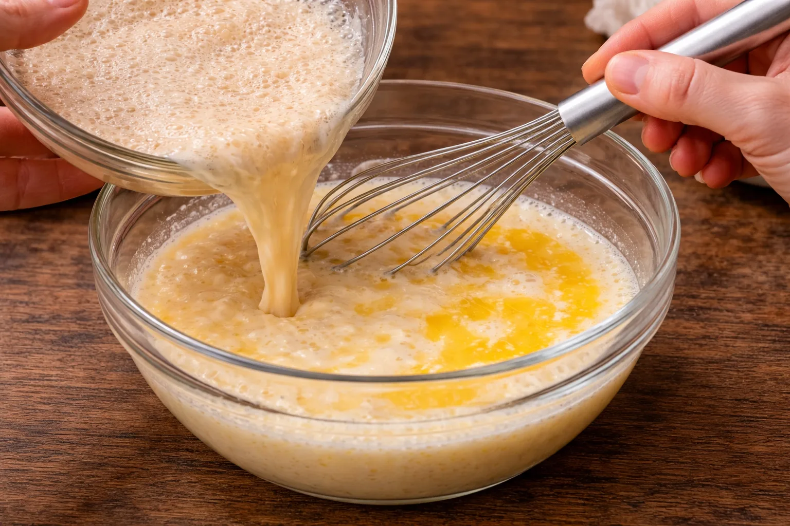 Додайте молоко з дріжджами та розтоплене вершкове масло, перемішайте.