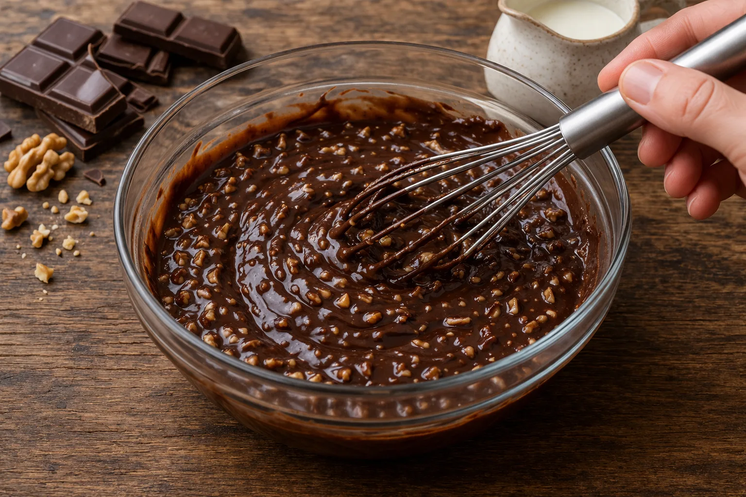 Шоколад розтопіть з вершками до однорідної маси, додайте подрібнені горіхи та перемішайте.